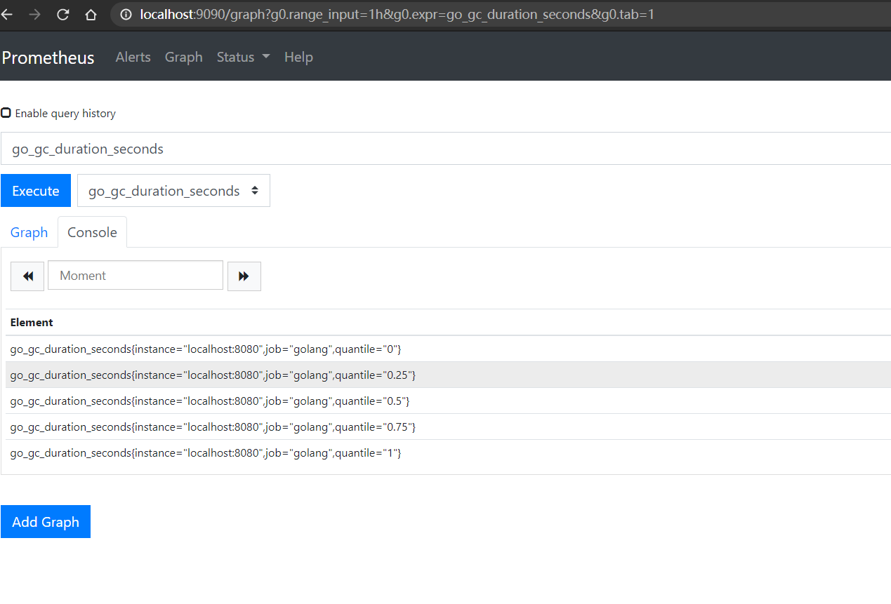 启动Promethues等待10s,Golang指标就会被采集到Promethues的时序数据库中了,访问 http://localhost:9090/ 得到如下效果